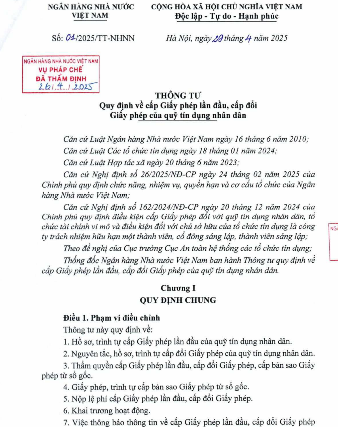 Thông tư 01 Quy định về cấp Giấy phép lần đầu, cấp đổi Giấy phép của quỹ tín dụng nhân dân