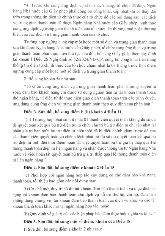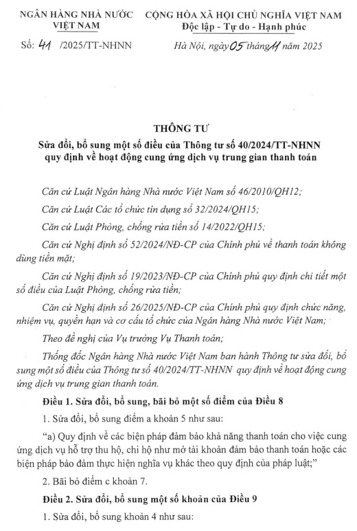 Thông tư 41 Sửa đổi, bổ sung một số điều của Thông tư 40/2024/TT-NHNN quy định về hoạt động cung ứng dịch vụ trung gian thanh toán