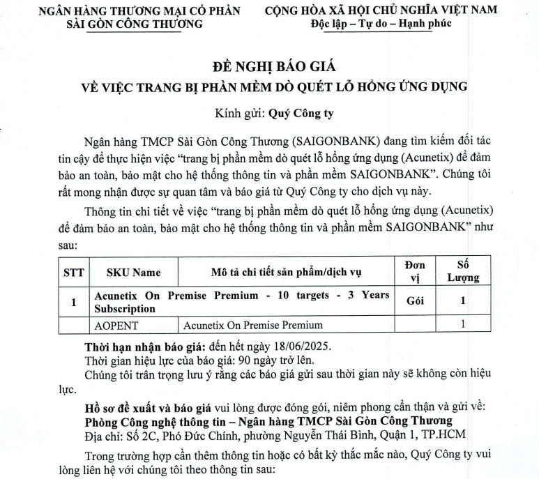 ĐỀ NGHỊ BÁO GIÁ VỀ VIỆC TRANG BỊ PHẦN MỀM DÒ QUÉT LỖ LỔNG ỨNG DỤNG