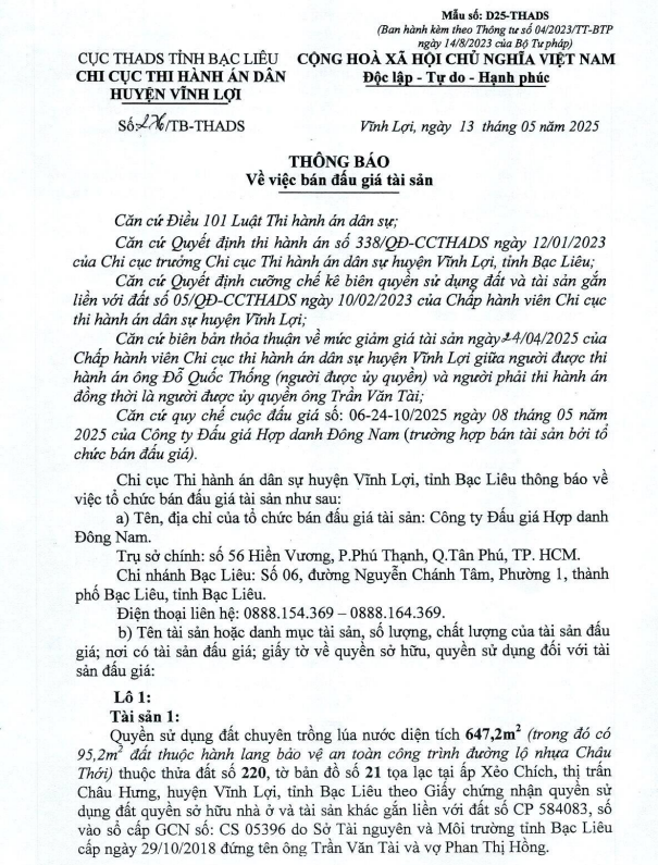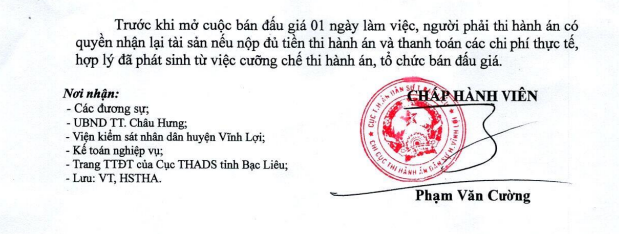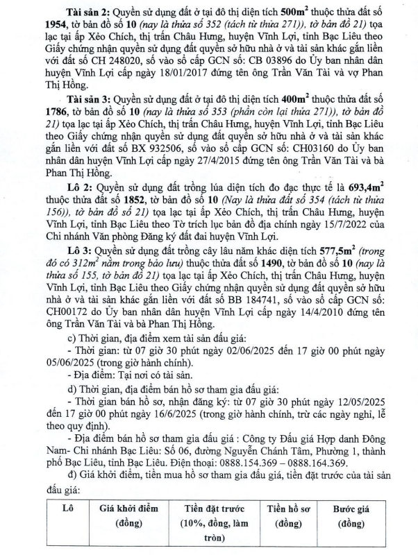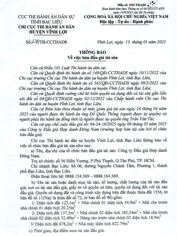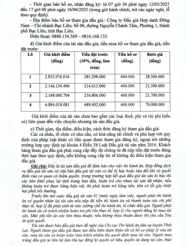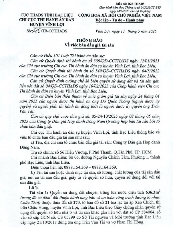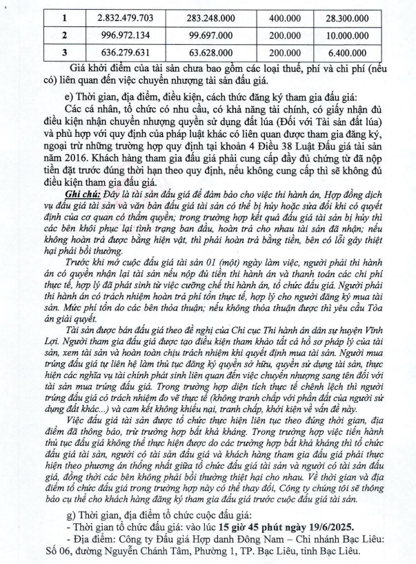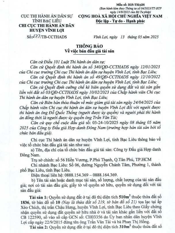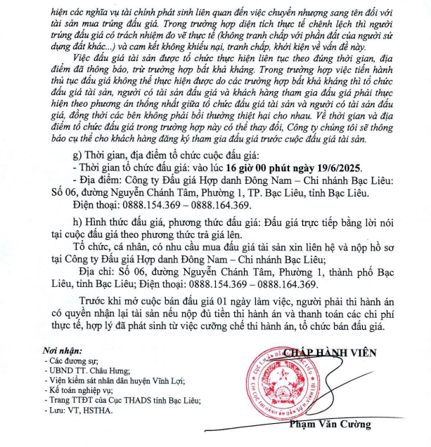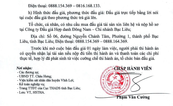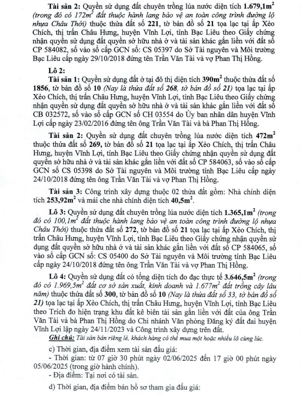 THÔNG BÁO BÁN ĐẤU GIÁ TÀI SẢN TẠI CHI NHÁNH BẠC LIÊU