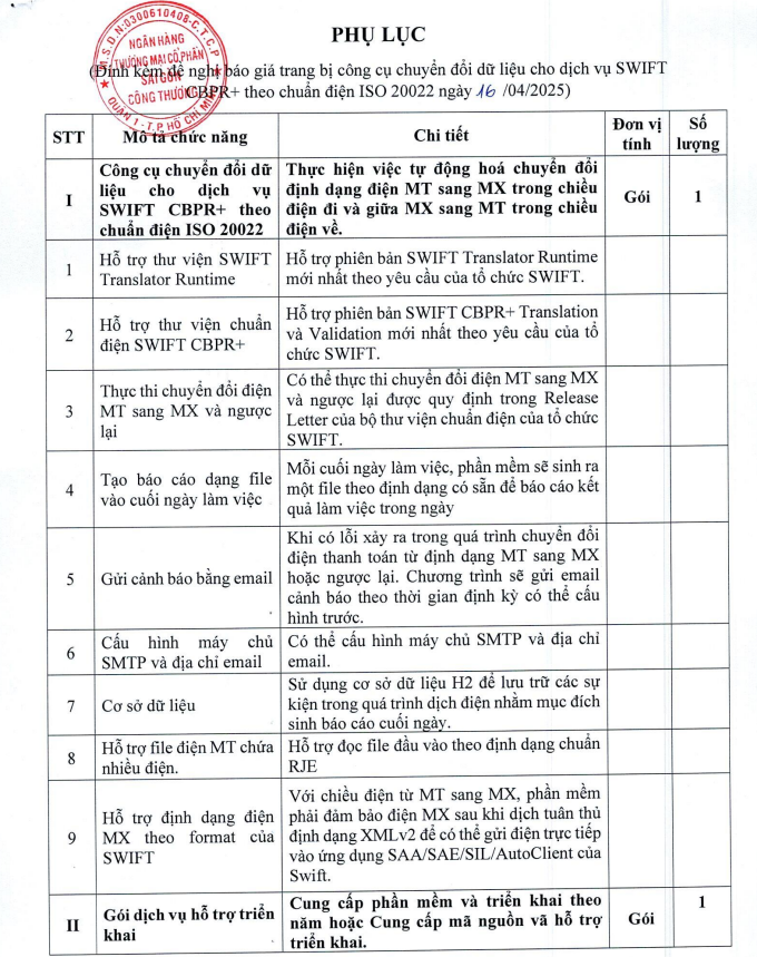 ĐỀ NGHỊ BÁO GIÁ CÔNG VIỆC CHUYỂN ĐỔI DỮ LIỆU CHO DỊCH VỤ SWIFT CBPR+ THEO CHUẨN ĐIỆN ISO 20022