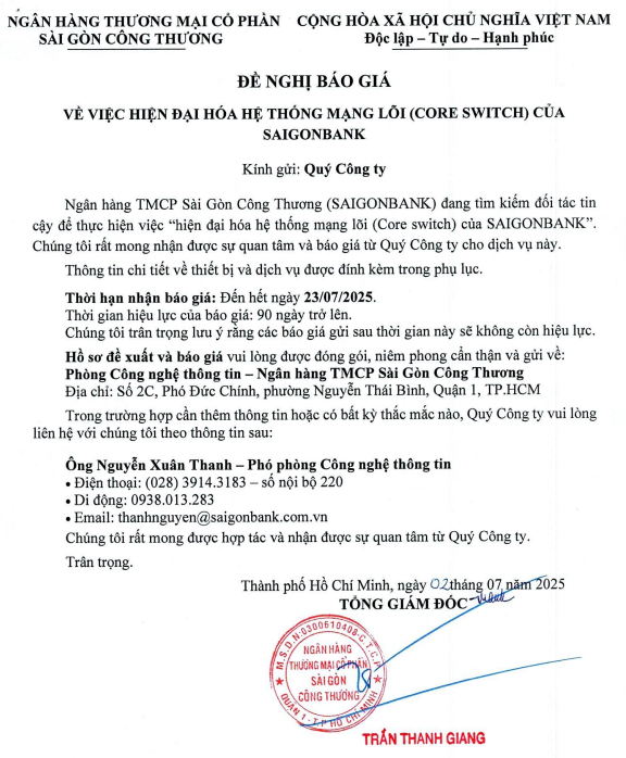 ĐỀ NGHỊ BÁO GIÁ VỀ VIỆC HIỆN ĐẠI HÓA MẠNG LÕI (CORE SWITCH) CỦA SAIGONBANK