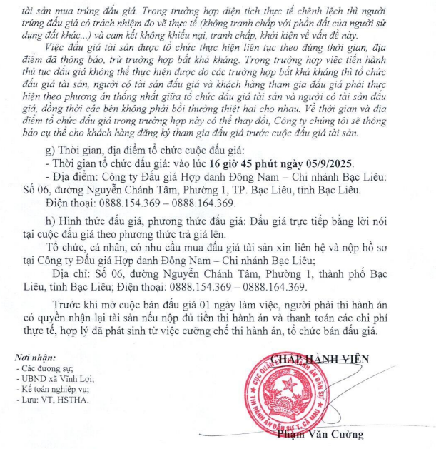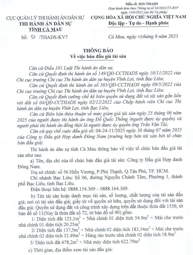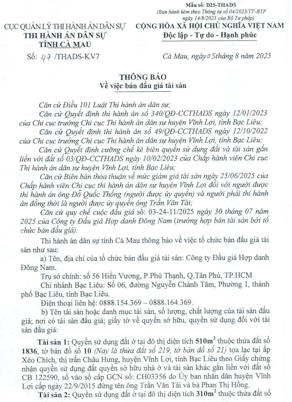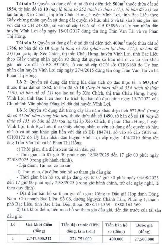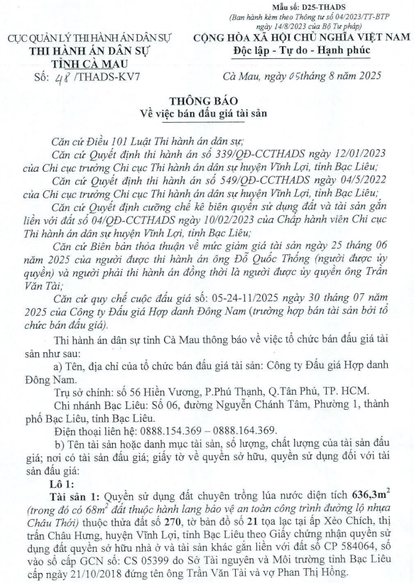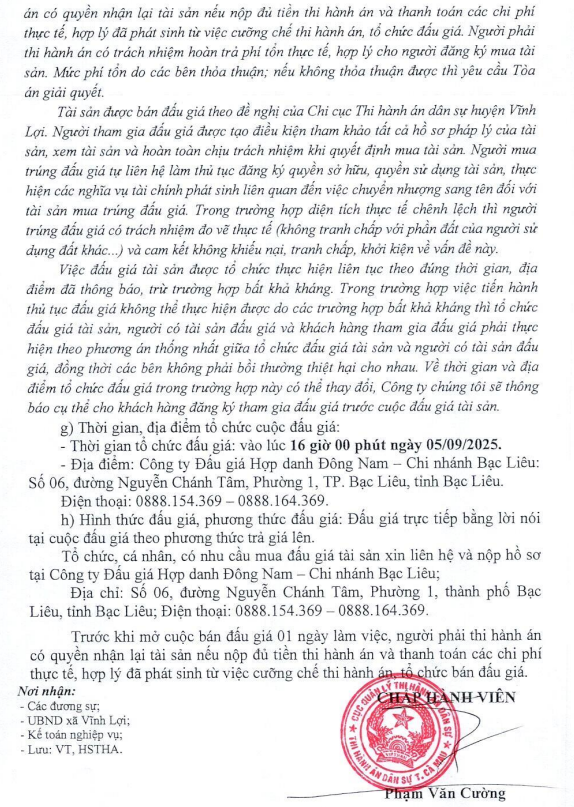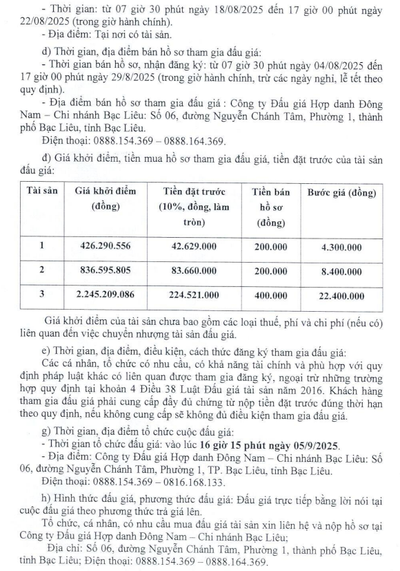 THÔNG BÁO BÁN ĐẤU GIÁ TÀI SẢN TẠI CHI NHÁNH BẠC LIÊU