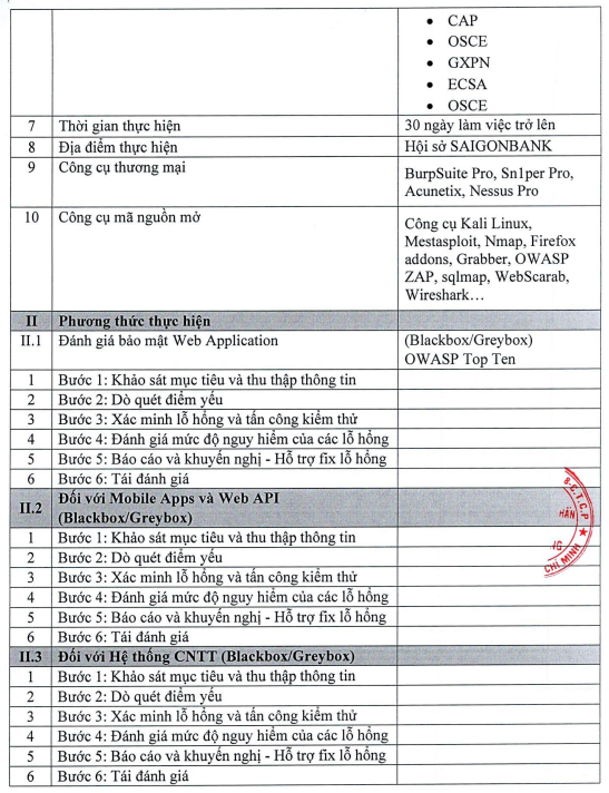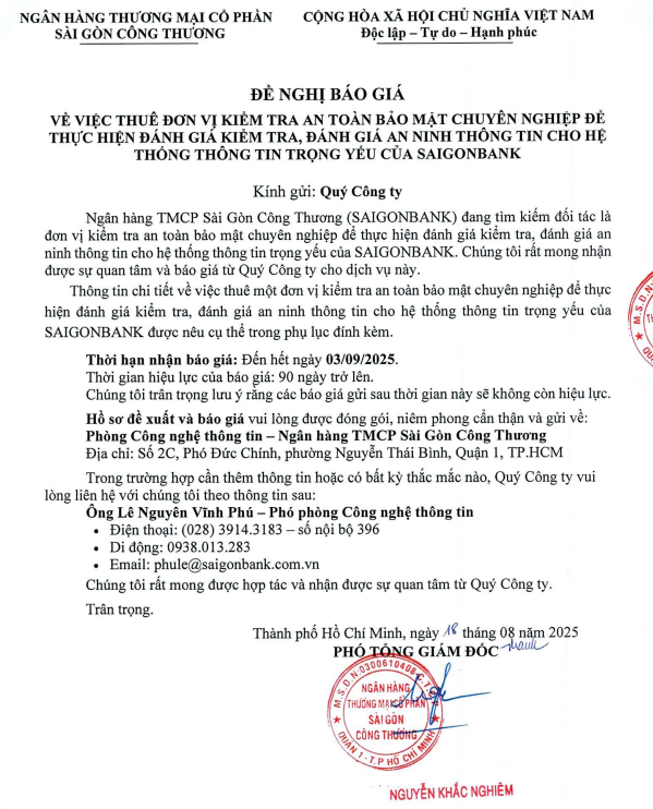 ĐỀ NGHỊ BÁO GIÁ VỀ VIỆC THUÊ ĐƠN VỊ KIỂM TRA ATBM CHUYÊN NGHIỆP ĐỂ THỰC HIỆN ĐÁNH GIÁ KIỂM TRA, ĐÁNH GIÁ ANTT CHO HTTT TRỌNG YẾU CỦA SAIGONBANK