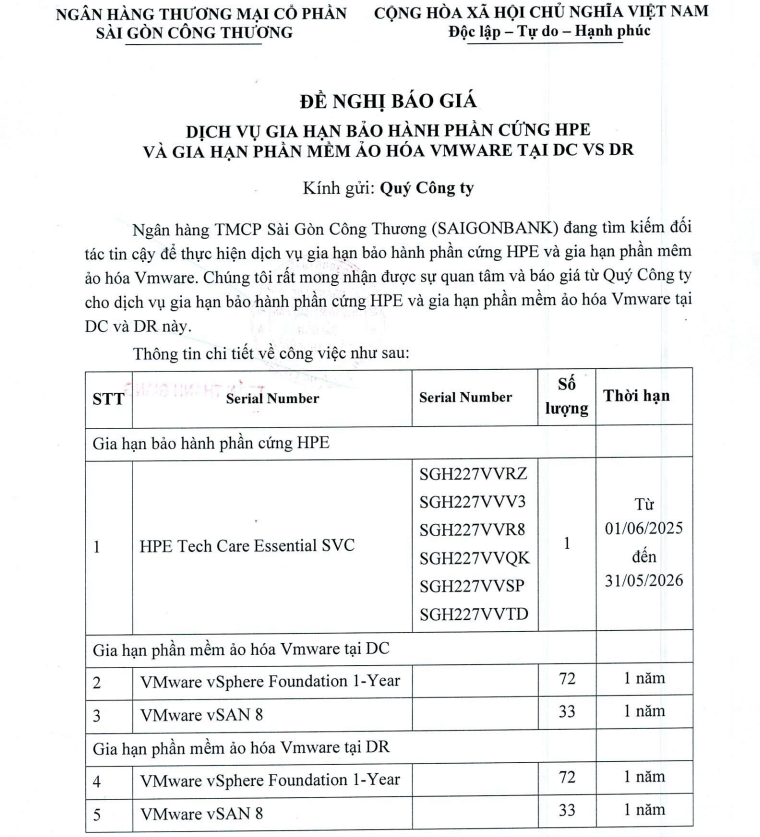 ĐỀ NGHỊ BÁO GIÁ DỊCH VỤ BẢO HÀNH PHẦN CỨNG HPE VÀ GIA HẠN PHẦN MỀM ẢO HÓA VMWARE TẠI DC VS DR