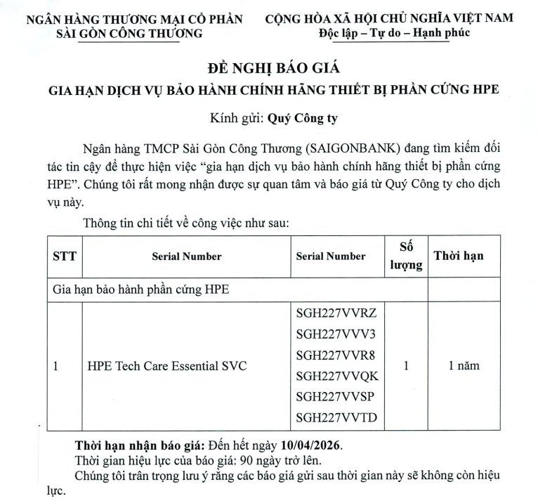 ĐỀ NGHỊ BÁO GIÁ GIA HẠN DỊCH VỤ BẢO HÀNH CHÍNH HÃNG THIẾT BỊ PHẦN CỨNG HPE