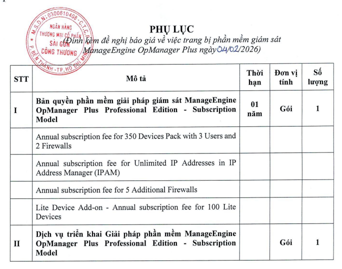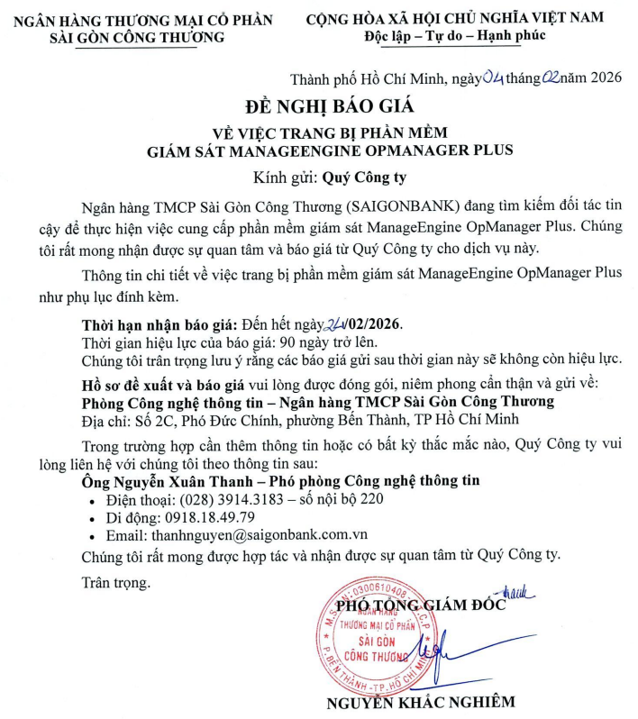 ĐỀ NGHỊ BÁO GIÁ VỀ VIỆC TRANG BỊ PHẦN MỀM GIÁM SÁT MANAGEENGINE OPMANAGER PLUS