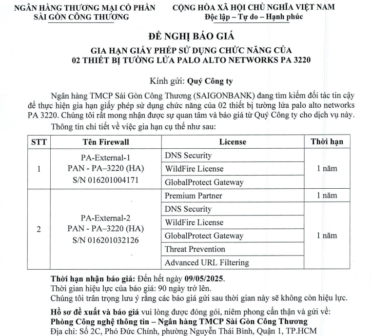 ĐỀ NGHỊ BÁO GIÁ GIA HẠN GIẤY PHÉP SỬ DỤNG CHỨC NĂNG CỦA 02 THIẾT BỊ TƯỜNG LỬA PALO ALTO NETWORKS PA-3220