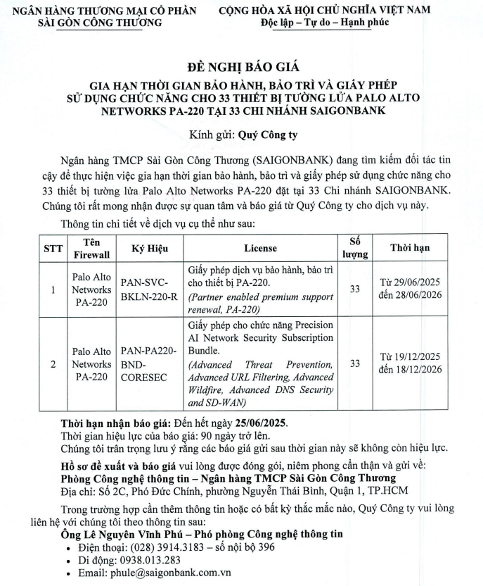 ĐỀ NGHỊ BÁO GIÁ GIA HẠN THỜI GIAN BẢO HÀNH, BẢO TRÌ VÀ GIẤY PHÉP SỬ DỤNG CHỨC NĂNG CHO 33 THIẾT BỊ TƯỜNG LỬA PALO ALTO NETWORKS PA-220 TẠI 33 CHI NHÁNH SAIGONBANK