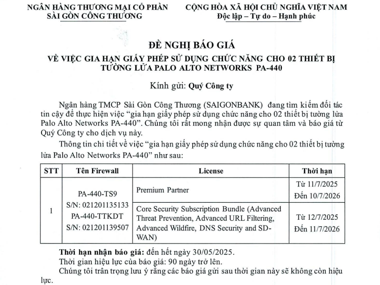 ĐỀ NGHỊ BÁO GIÁ VỀ VIỆC GIA HẠN GIẤY PHÉP SỬ DỤNG CHỨC NĂNG CHO 02 THIẾT BỊ TƯỜNG LỬA PALO ALTO NETWORKS PA-440