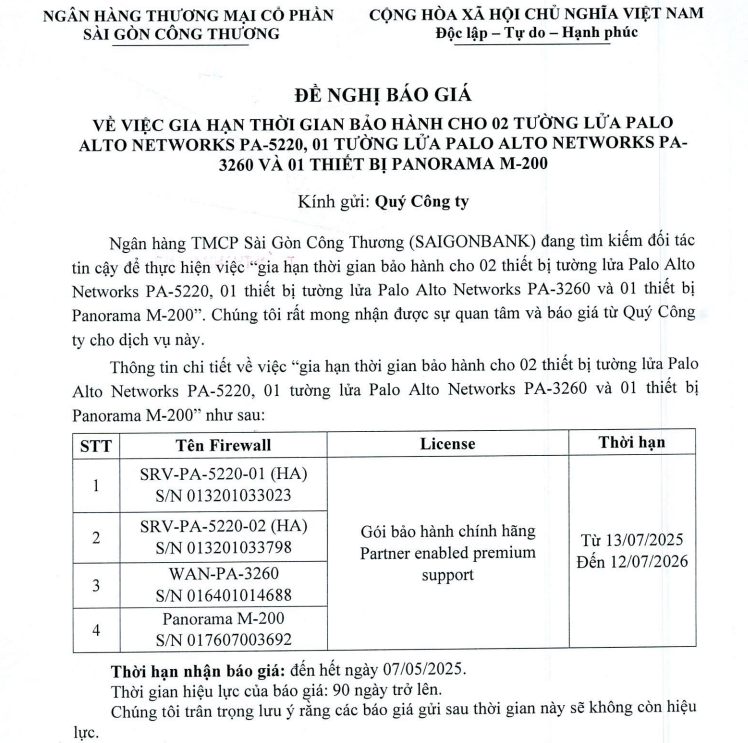 ĐỀ NGHỊ BÁO GIÁ GIA HẠN THỜI GIAN BẢO HÀNH CHO 02 TƯỜNG LỬA PALO ALTO NETWORKS PA-5220, 01 TƯỜNG LỬA PALO ALTO NETWORKS PA-3260 VÀ 01 THIẾT BỊ PANORAMA M-200