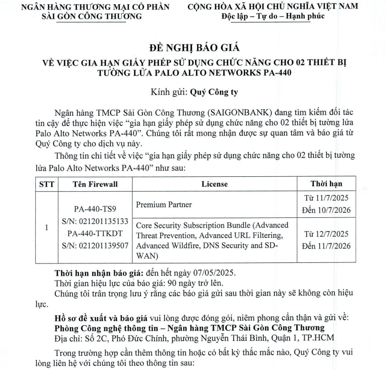 ĐỀ NGHỊ BÁO GIÁ VỀ VIỆC GIA HẠN GIẤY PHÉP SỬ DỤNG CHỨC NĂNG CHO 02 THIẾT BỊ TƯỜNG LỬA PALO ALTO NETWORKS PA-440