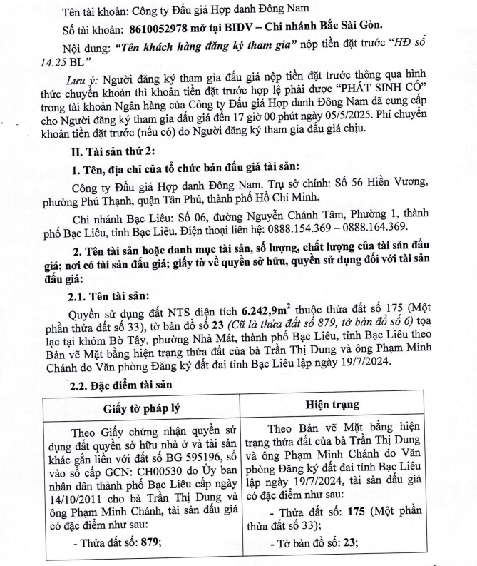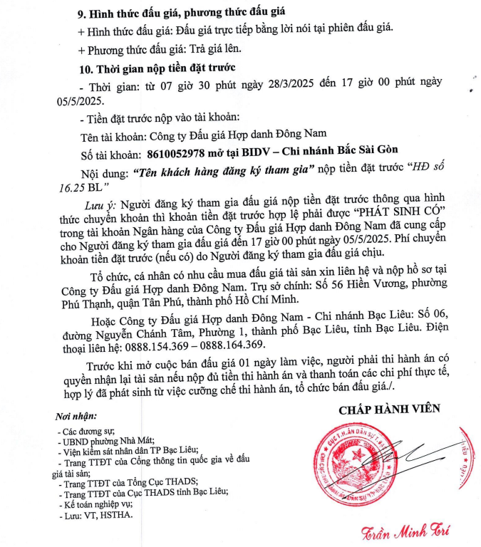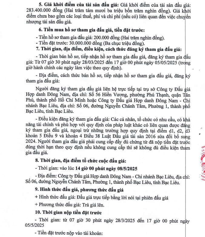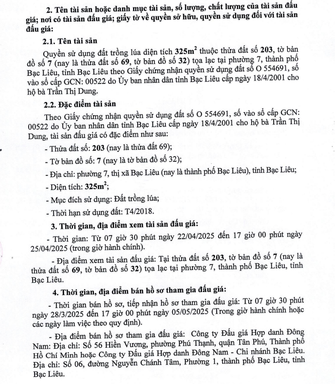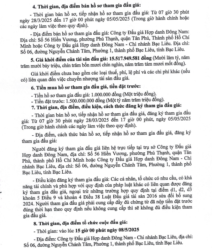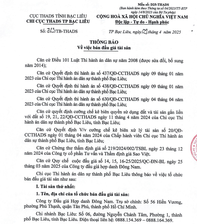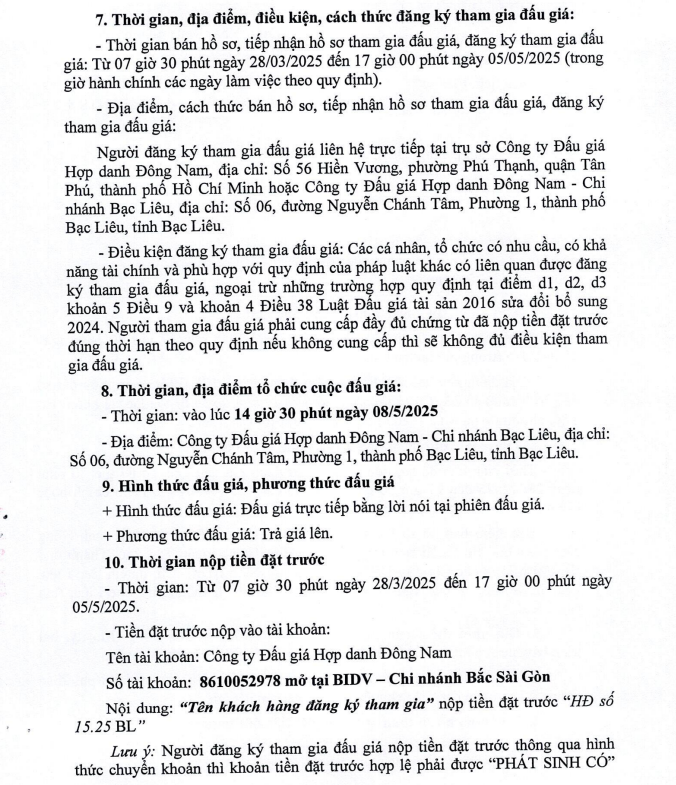 THÔNG BÁO BÁN ĐẤU GIÁ TÀI SẢN TẠI CHI NHÁNH BẠC LIÊU