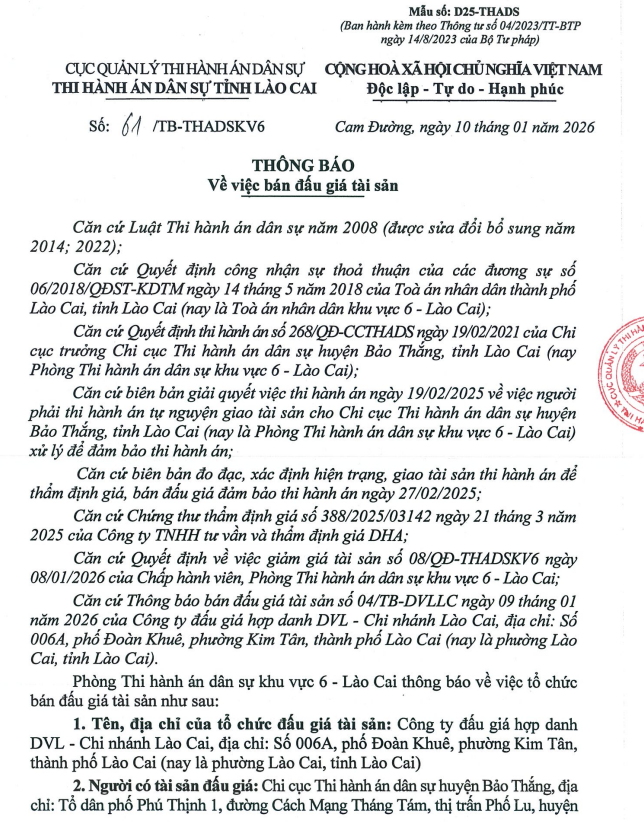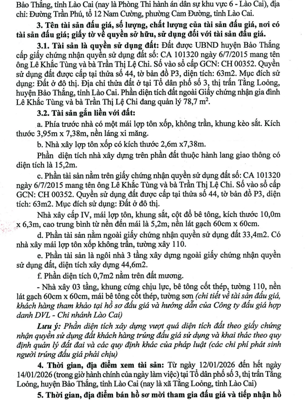 THÔNG BÁO BÁN ĐẤU GIÁ TÀI SẢN TẠI CHI NHÁNH LÀO CAI