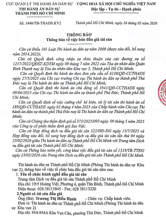 THÔNG BÁO VỀ VIỆC BÁN ĐẤU GIÁ TÀI SẢN TẠI CHI NHÁNH KHÁNH HỘI