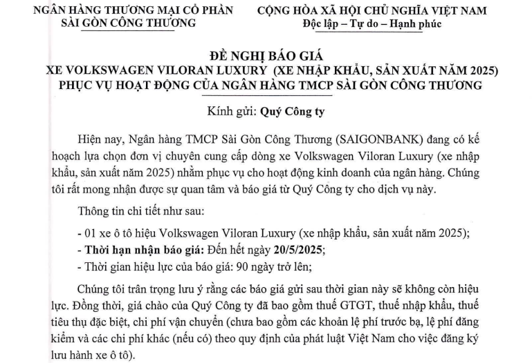 ĐỀ NGHỊ BÁO GIÁ XE VOLKSWAGEN VILOGAN LUXURY (XE NHẬP KHẨU, SẢN XUẤT NĂM 2025) PHỤC VỤ HOẠT ĐỘNG CỦA SAIGONBANK