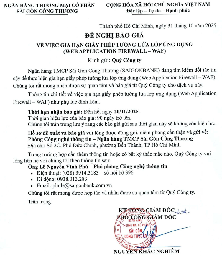 ĐỀ NGHỊ BÁO GIÁ VỀ VIỆC GIA HẠN GIẤY PHÉP SỬ DỤNG TƯỜNG LỬA LỚP ỨNG DỤNG (WEB APPLICATION FIREWALL - WAF)