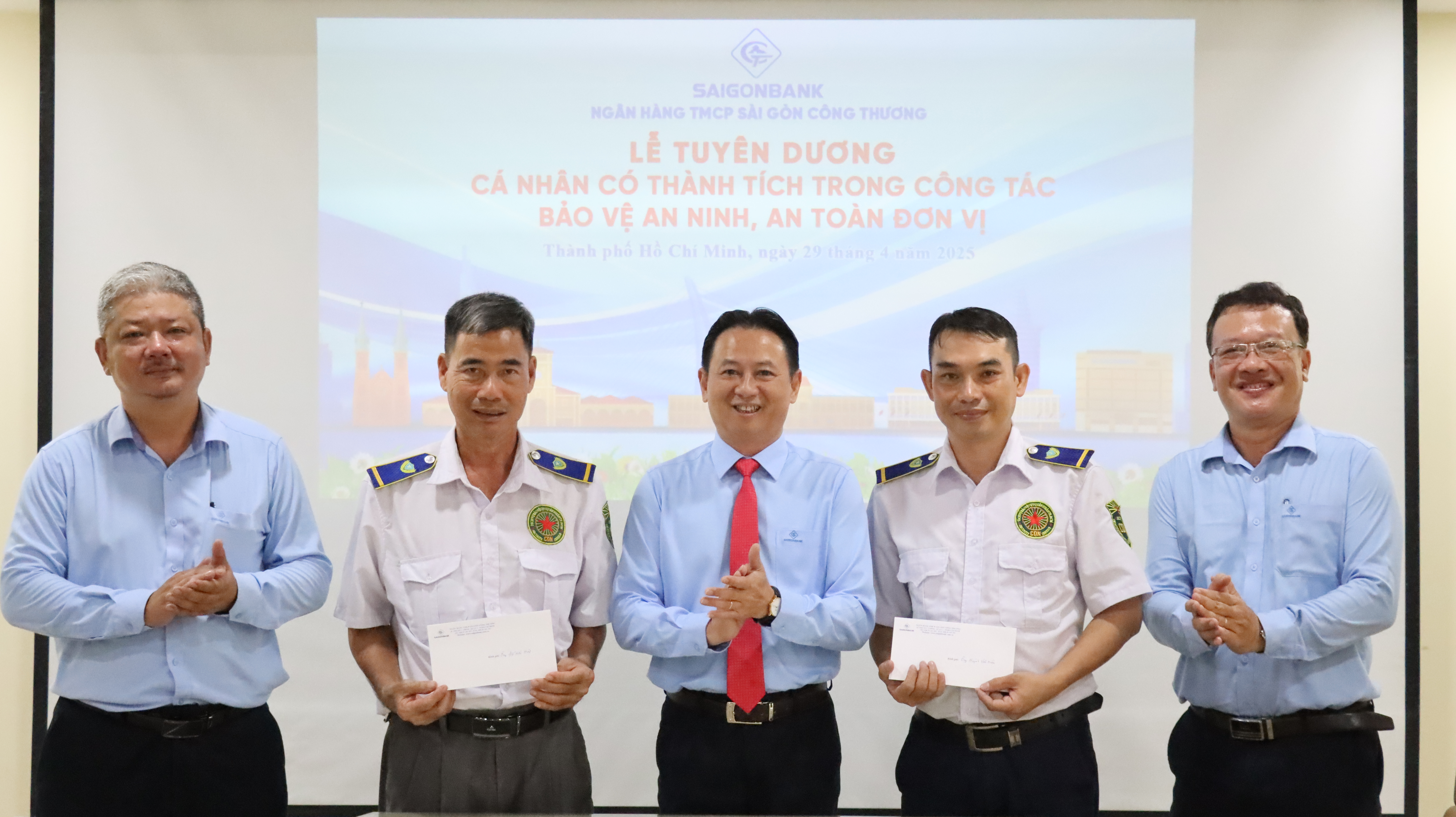 Nhằm kịp thời động viên tinh thần cảnh giác, tích cực tham gia phong trào Toàn dân bảo vệ an ninh Tổ quốc, ngày 29/4/2025 Ban lãnh đạo SAIGONBANK đã tổ chức khen thưởng đột xuất đối với hai cá nhân thuộc lực lượng bảo vệ chuyên nghiệp thuê ngoài làm nhiệm vụ tại Hội sở.