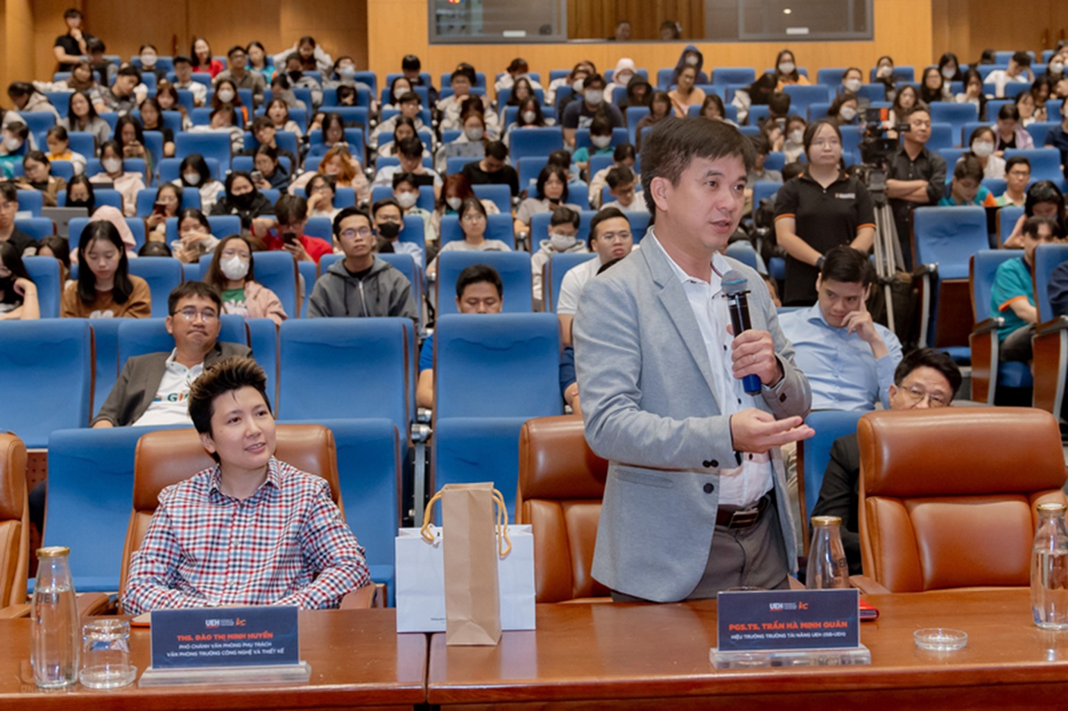 Với vai trò dẫn dắt và điều phối chương trình, PGS.TS. Trần Hà Minh Quân - Hiệu trưởng Trường Tài năng UEH đã khéo léo mở đầu bằng những phân tích sâu sắc về bản chất của khởi nghiệp trong bối cảnh giáo dục đại học hiện đại. Thầy nhấn mạnh: “Khởi nghiệp không chỉ là câu chuyện cá nhân, mà là hành trình hội tụ và kết nối giữa tri thức học thuật, công nghệ tiên tiến và dòng vốn đầu tư chiến lược. UEH cam kết đồng hành cùng cộng đồng khởi nghiệp thông qua các sáng kiến học thuật gắn liền với thực tiễn như Talkshow hôm nay."