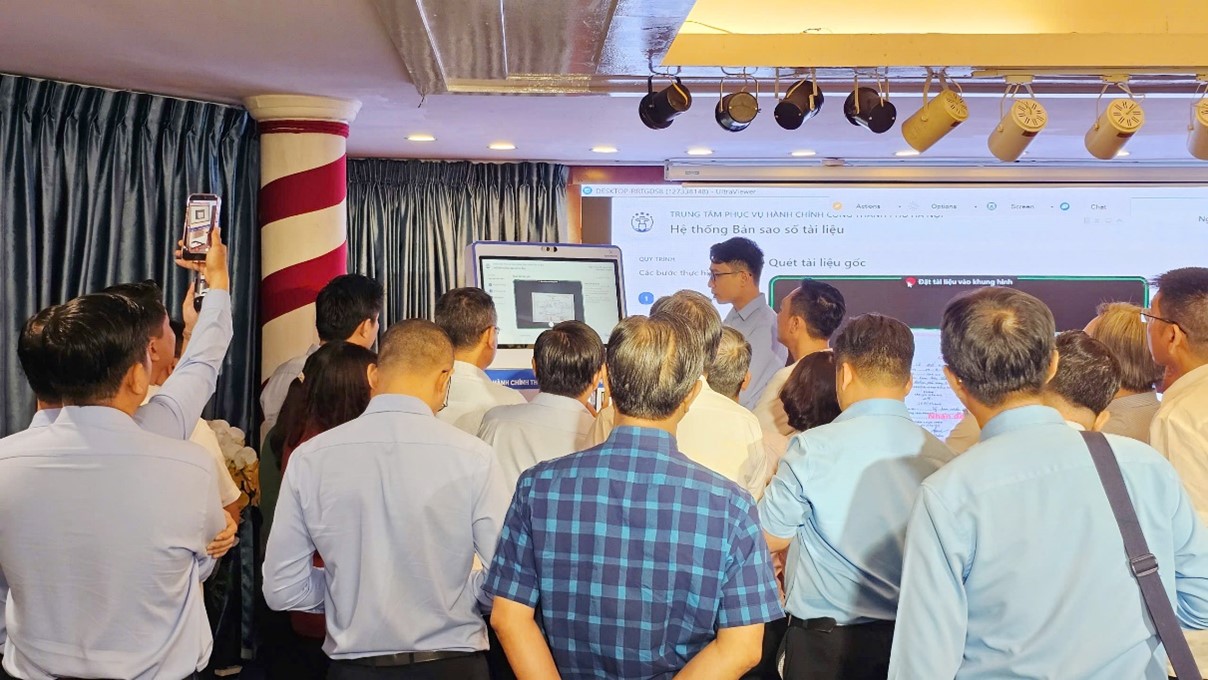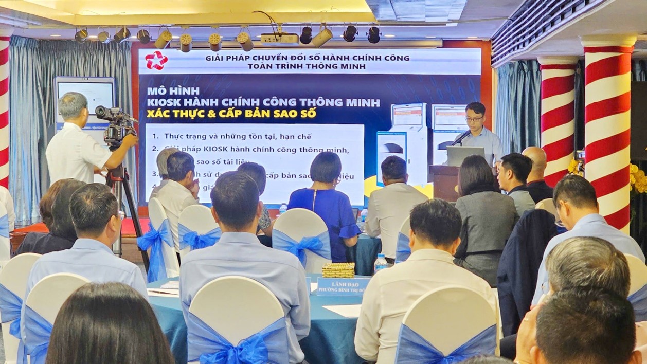Tại hội nghị, Công ty Phương Đông đã giới thiệu giải pháp “Kiosk thông minh” cho hệ thống xác thực và cấp bản sao số tài liệu điện tử, kết hợp trình chiếu video mô hình triển khai thực tế và tổ chức chạy thử trực tiếp trên thiết bị. Các nội dung trình bày cho thấy Kiosk thông minh có khả năng hỗ trợ người dân thực hiện thủ tục hành chính nhanh chóng, thuận tiện, giảm thời gian chờ đợi và áp lực cho bộ phận tiếp nhận hồ sơ.