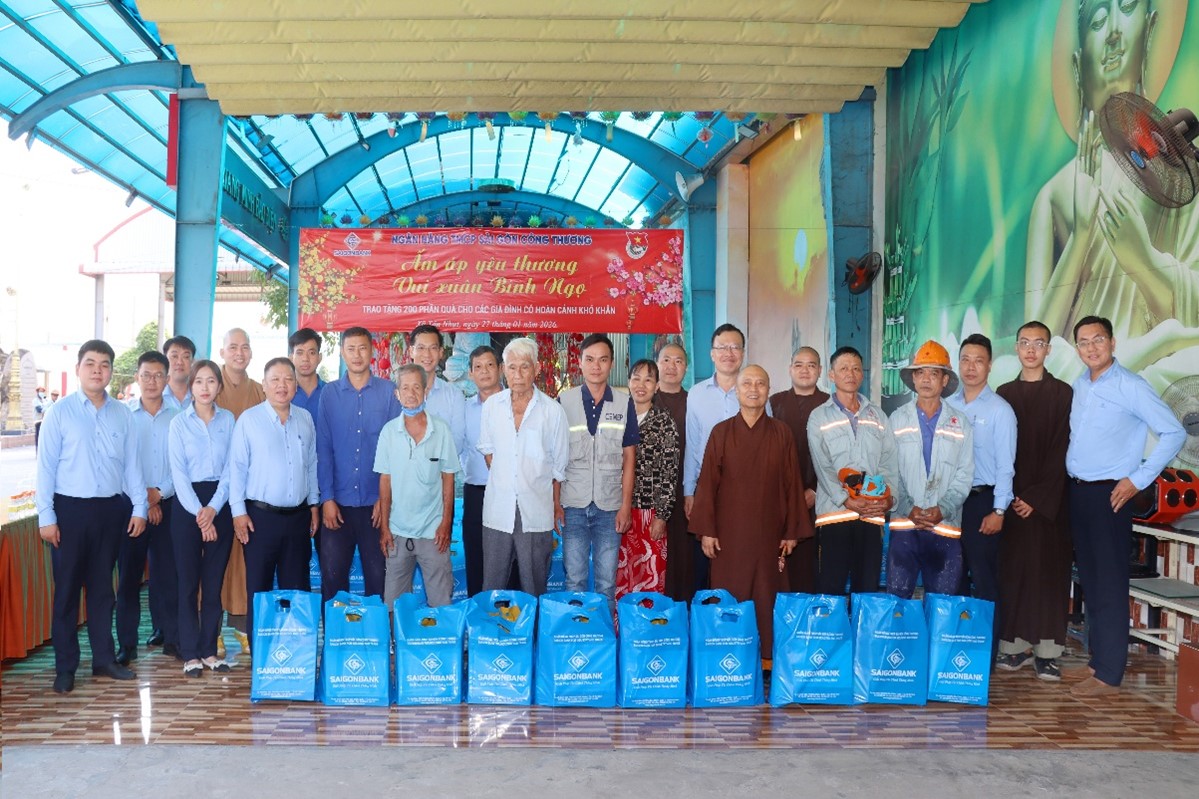 Sáng ngày 27/01/2026, Công đoàn và Đoàn Thanh niên Ngân hàng TMCP Sài Gòn Công thương (SAIGONBANK) đã phối hợp tổ chức chương trình trao quà Tết cho các gia đình có hoàn cảnh khó khăn trên địa bàn xã Tân Nhựt, TP. Hồ Chí Minh. Chương trình được tổ chức tại Chùa Pháp Bảo với sự tham gia của Công đoàn, Đoàn thanh niên SAIGONBANK, Chi nhánh Bình Chánh, Nhà chùa cùng đông đảo người dân.