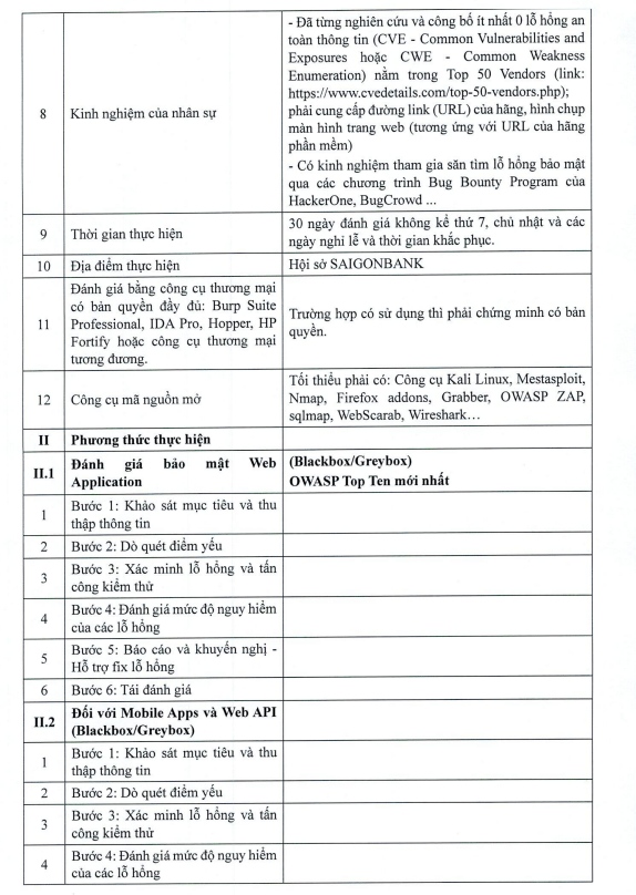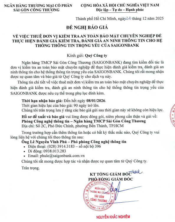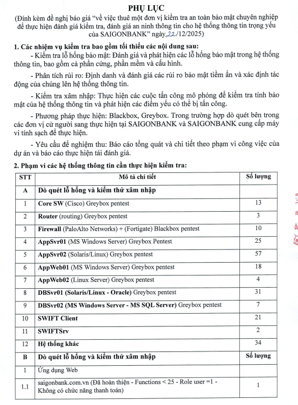 ĐỀ NGHỊ BÁO GIÁ VỀ VIỆC THUÊ ĐƠN VỊ KIỂM TRA ATBM CHUYÊN NGHIỆP ĐỂ THỰC HIỆN ĐÁNH GIÁ KIỂM TRA, ĐÁNH GIÁ ANTT CHO HTTT TRỌNG YẾU CỦA SAIGONBANK