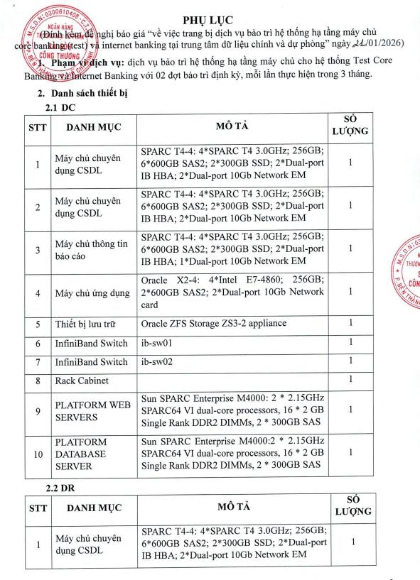 ĐỀ NGHỊ BÁO GIÁ VỀ VIỆC TRANG BỊ BẢO TRÌ HỆ THỐNG HẠ TẦNG MÁY CHỦ CORE BANKING (TEST) VÀ INTERNET BANKING TẠI TẠI TRUNG TÂM DỮ LIỆU CHÍNH VÀ DỰ PHÒNG