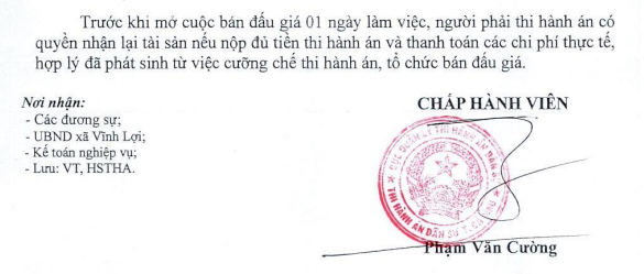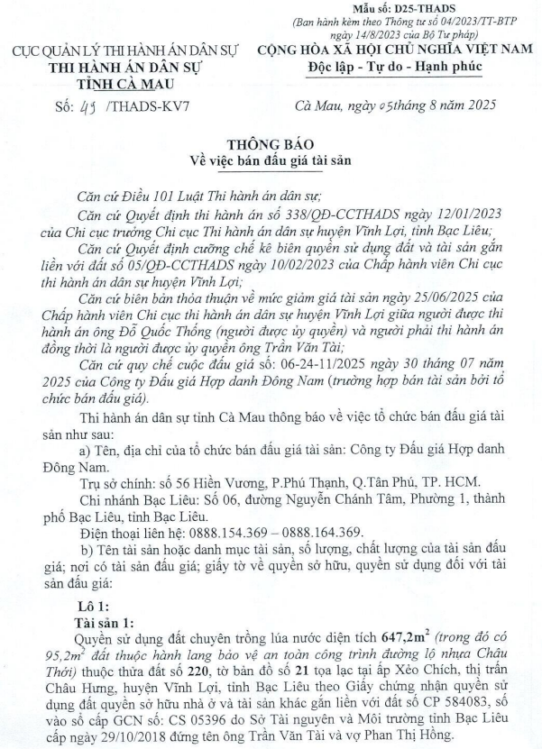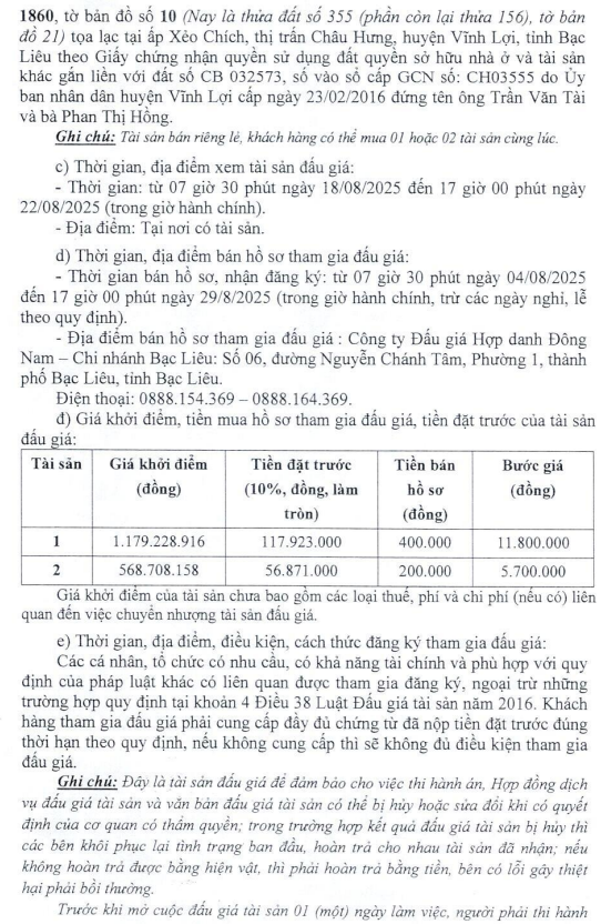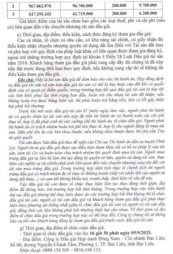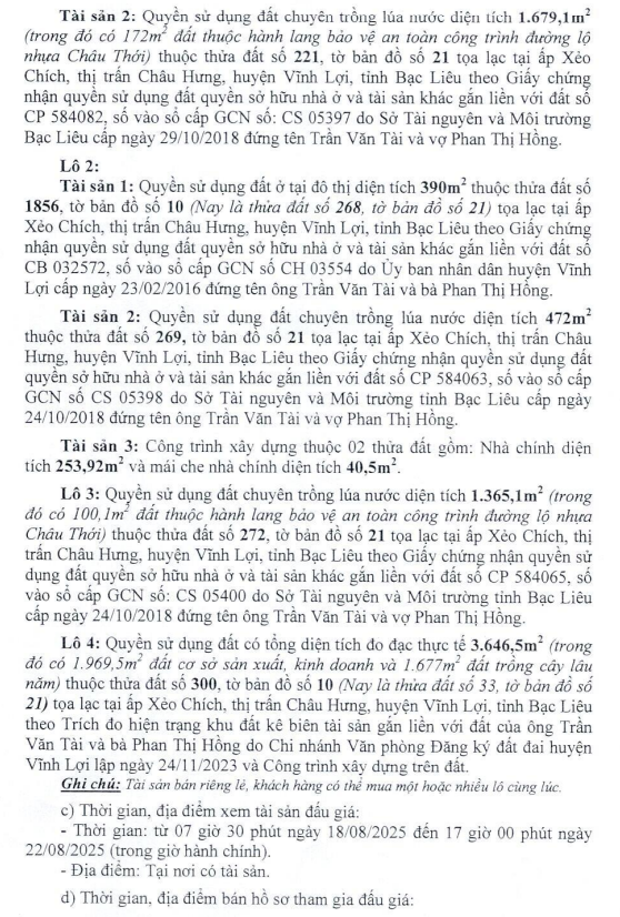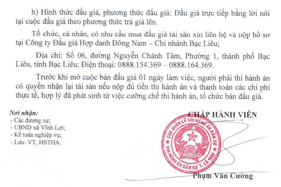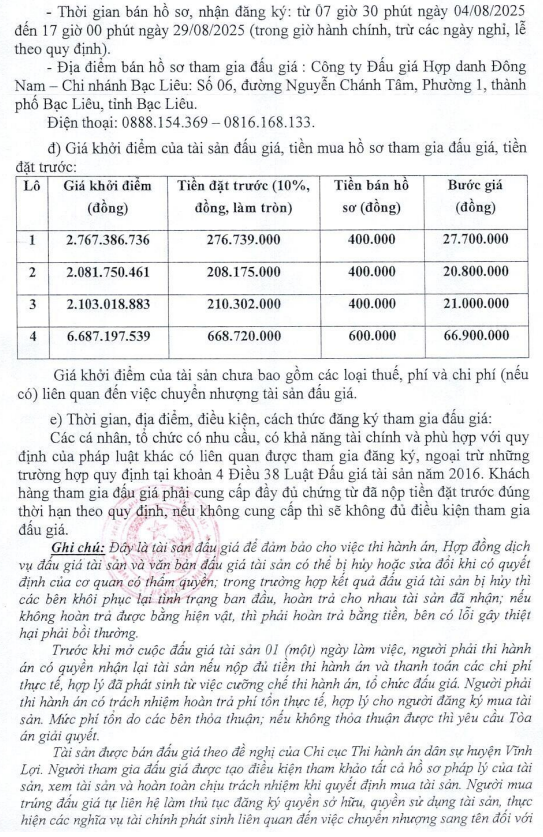 THÔNG BÁO BÁN ĐẤU GIÁ TÀI SẢN TẠI CHI NHÁNH BẠC LIÊU