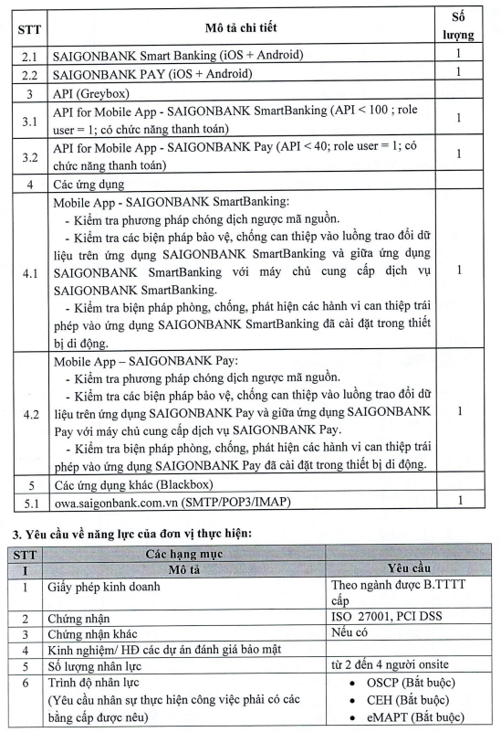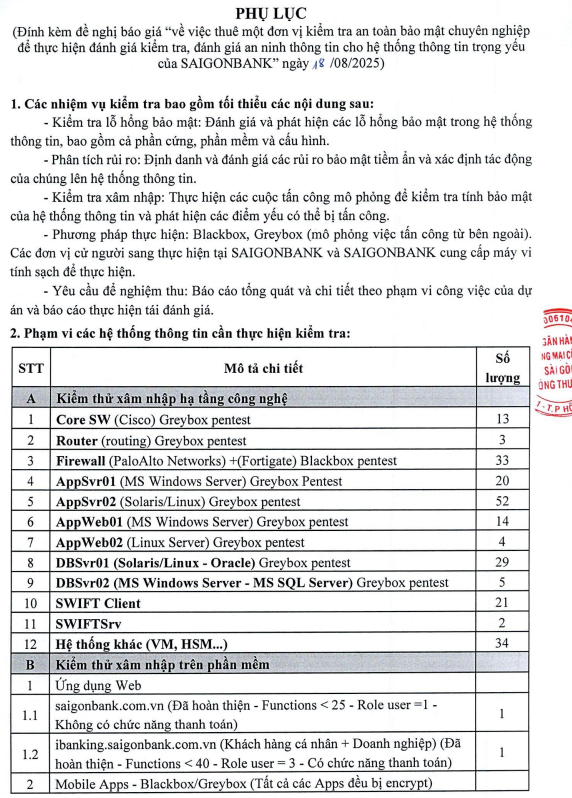 ĐỀ NGHỊ BÁO GIÁ VỀ VIỆC THUÊ ĐƠN VỊ KIỂM TRA ATBM CHUYÊN NGHIỆP ĐỂ THỰC HIỆN ĐÁNH GIÁ KIỂM TRA, ĐÁNH GIÁ ANTT CHO HTTT TRỌNG YẾU CỦA SAIGONBANK