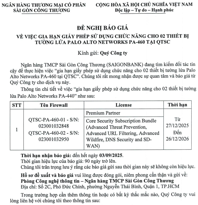 ĐỀ NGHỊ BÁO GIÁ VỀ VIỆC GIA HẠN GIẤY PHÉP SỬ DỤNG CHỨC NĂNG CHO 02 THIẾT BỊ TƯỜNG LỬA PALO ALTO NETWORKS PA-460 TẠI QTSC