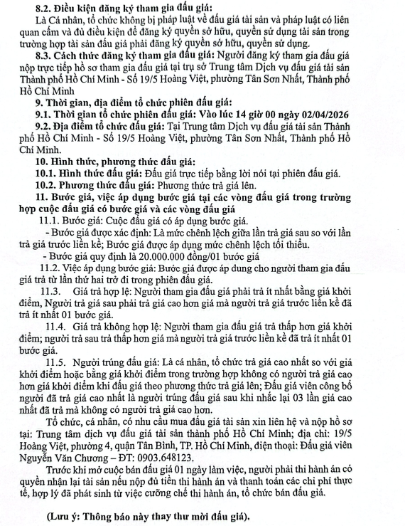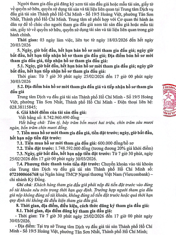 THÔNG BÁO BÁN ĐẤU GIÁ TÀI SẢN TẠI CHI NHÁNH BÀ CHIỂU