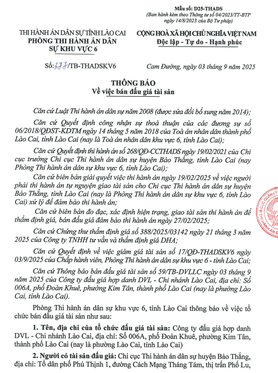THÔNG BÁO BÁN ĐẤU GIÁ TÀI SẢN TẠI CHI NHÁNH LÀO CAI