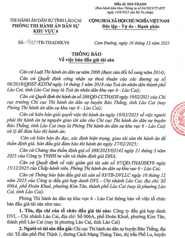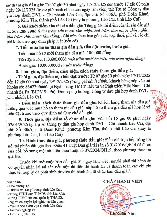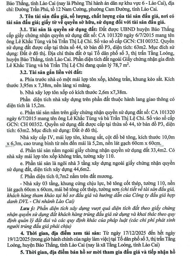 THÔNG BÁO BÁN ĐẤU GIÁ TÀI SẢN TẠI CHI NHÁNH LÀO CAI
