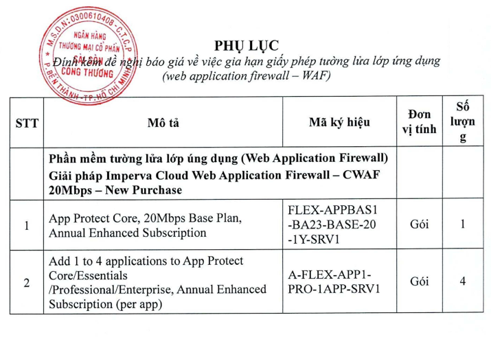 ĐỀ NGHỊ BÁO GIÁ VỀ VIỆC GIA HẠN GIẤY PHÉP SỬ DỤNG TƯỜNG LỬA LỚP ỨNG DỤNG (WEB APPLICATION FIREWALL - WAF)