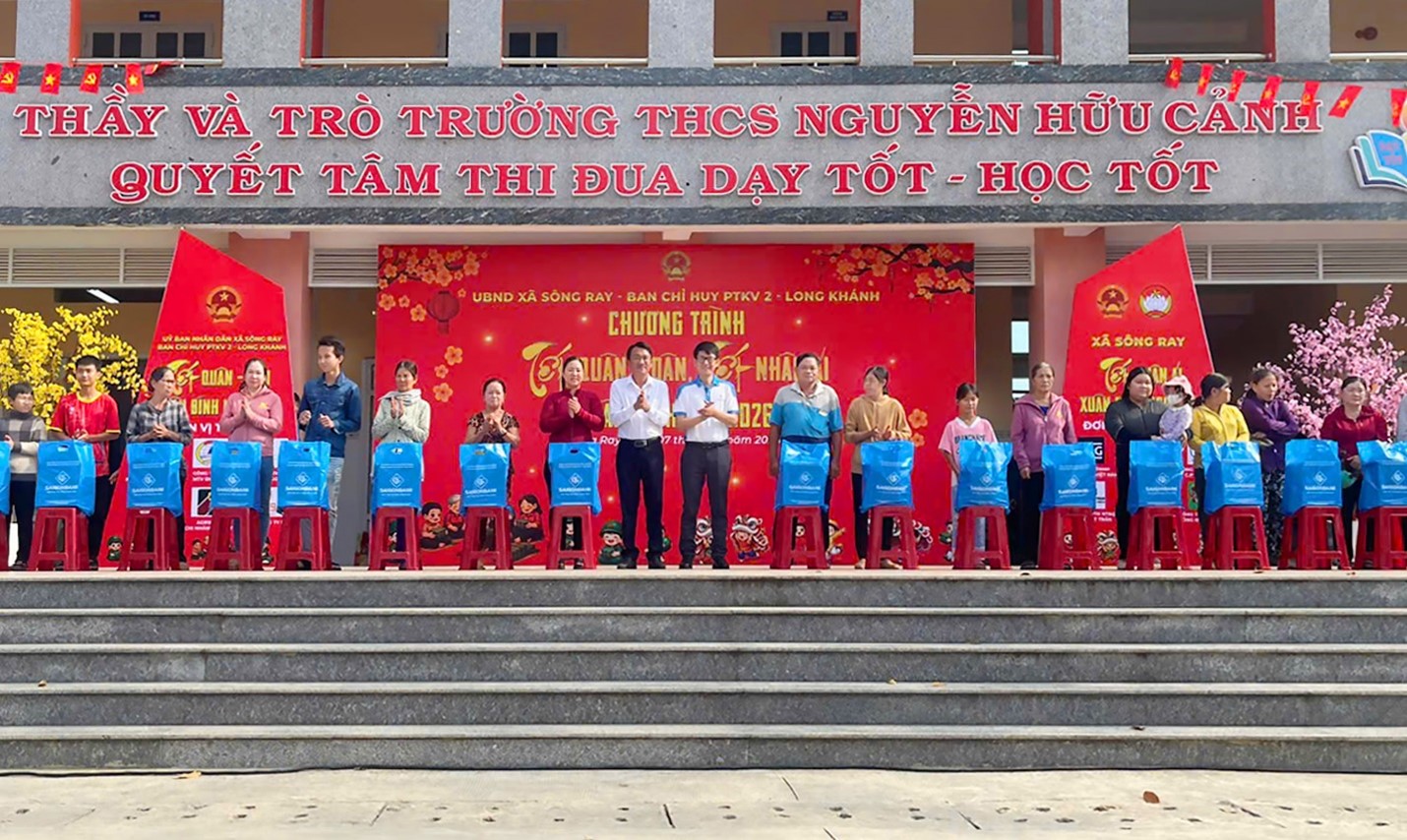 Sáng ngày 07/02/2026, SAIGONBANK – Chi nhánh Đồng Nai đã phối hợp cùng Ủy ban Nhân dân xã Sông Ray và Ban Chỉ huy Phòng thủ Khu vực 2 tổ chức chương trình trao tặng quà Tết cho các hộ dân có hoàn cảnh khó khăn trên địa bàn xã Sông Ray, tỉnh Đồng Nai.